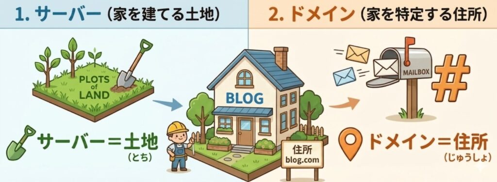 サーバーとドメインは、ブログという「家」を建てるために必要な要素です。